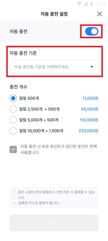 자동 충전 여부 및 자동 충전 기준을 선택해주세요.