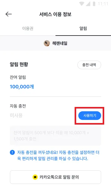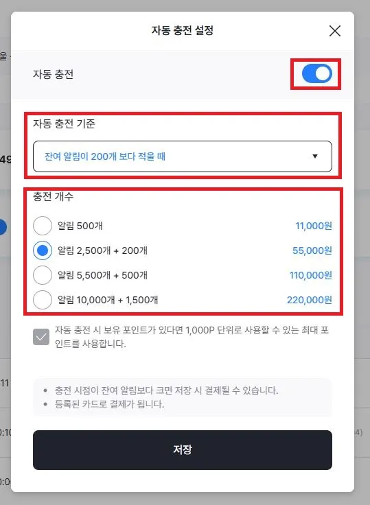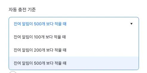 [자동 충전]은 설정한 잔여 알림 기준 이하가 되면 자동으로 알림 충전이 이루어집니다.
