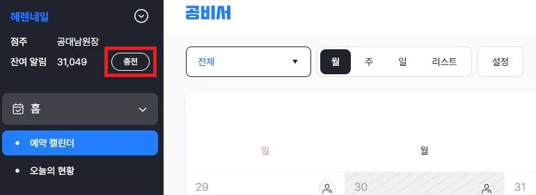 PC 공비서 : 로그인 > 왼쪽 상단 > ‘충전’ > ‘충전하기 or 사용하기’