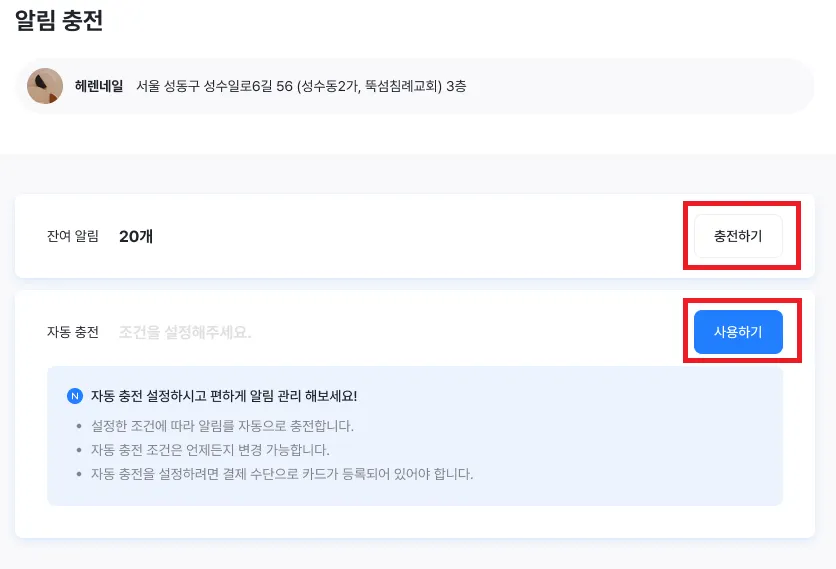 보유하신 잔여 알림이 충전 기준에 부합할 때 ‘자동 충전’이 진행됩니다.