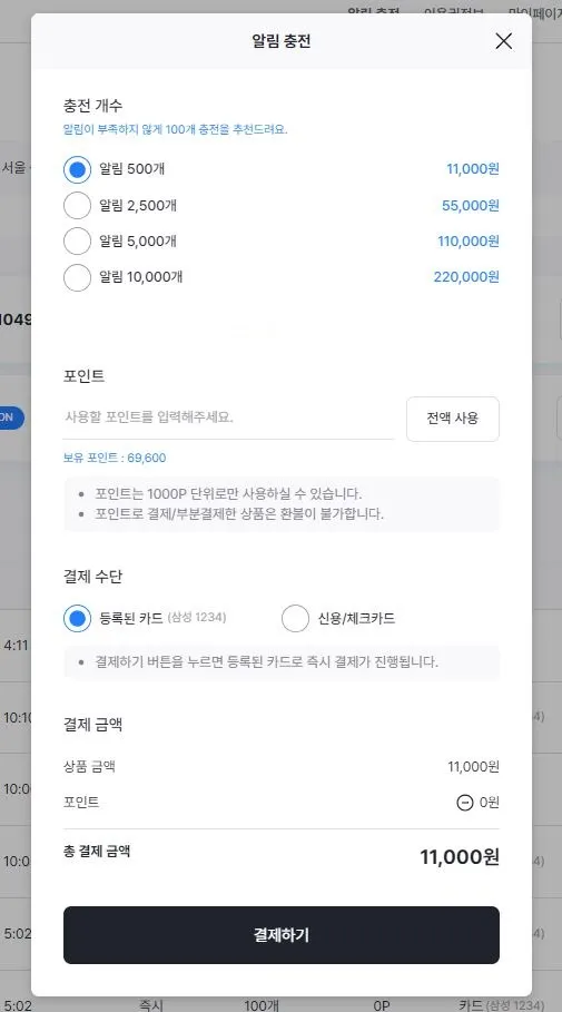 1. 알림 충전은 카드 결제로만 가능하며, 무통장 입금은 불가합니다.